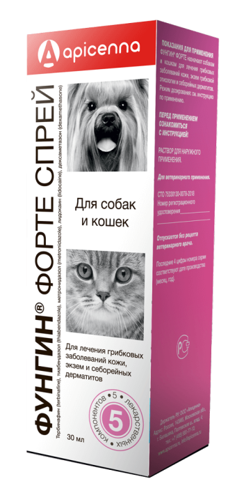 Фунгин Форте назначают собакам и кошкам для лечения грибковых заболеваний кожи, экзем грибковой этиологии и себорейных дерматитов.