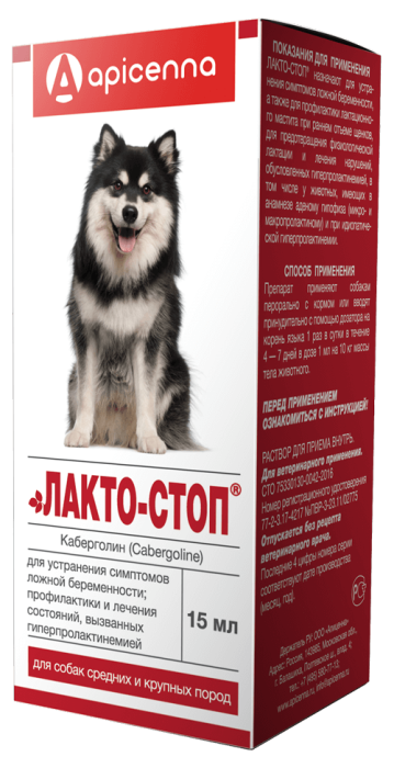 Лакто-Стоп подавляет лактацию, предотвращает увеличение молочных желез и профилактирует раз- витие лактационного мастита. Снижение уровня пролактина способствует быстрому исчезновению при- знаков ложной беременности у животного.