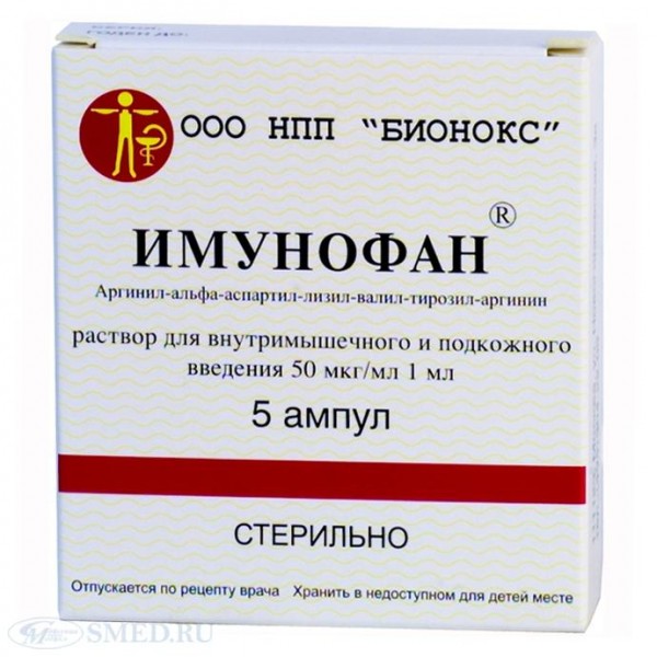 50 мкг Имунофана (аргинил-альфа-аспартил-лизил-валил-тирозил-аргинин) - гексапептида с молекулярной массой 836 Да.