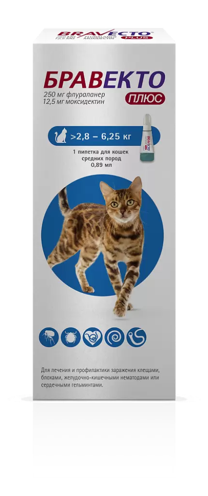 1 пипетка (0,89 мл) «Бравекто Плюс 250 мг/12,5 мг» содержит 250 мг флураланера и 12,5 мг моксидектина.