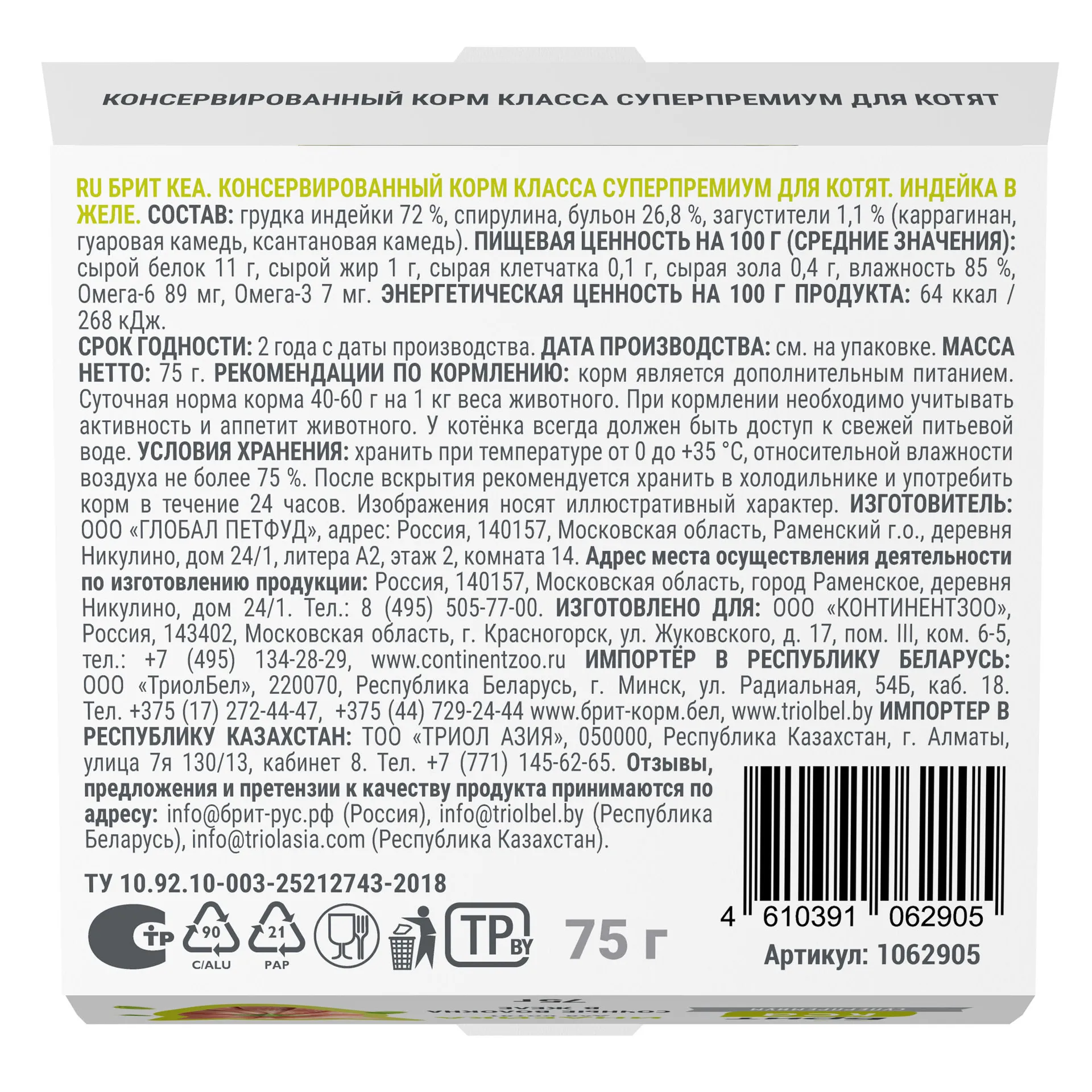 Вся линейка паучей и ламиcтеров Брит Кеа "Волокна в желе" построена на индейке как основном белке, с добавками разных морепродуктов. Это уникальная фишка линейки — моно-белковый состав на базе индейки + сочные волокна и желе, обогащенные спирулиной и таурином, создающие функциональное лакомство для взрослых кошек и котят. Мягкий и полезный корм для котят с мясом индейки подходит для первого прикорма и чувствительных малышей. Особенности: монопротеиновый состав снижает риск аллергий; оптимален для пищеварения на этапе роста; спирулина поддерживает иммунитет; текстура желе облегчает переход к твердой пище.