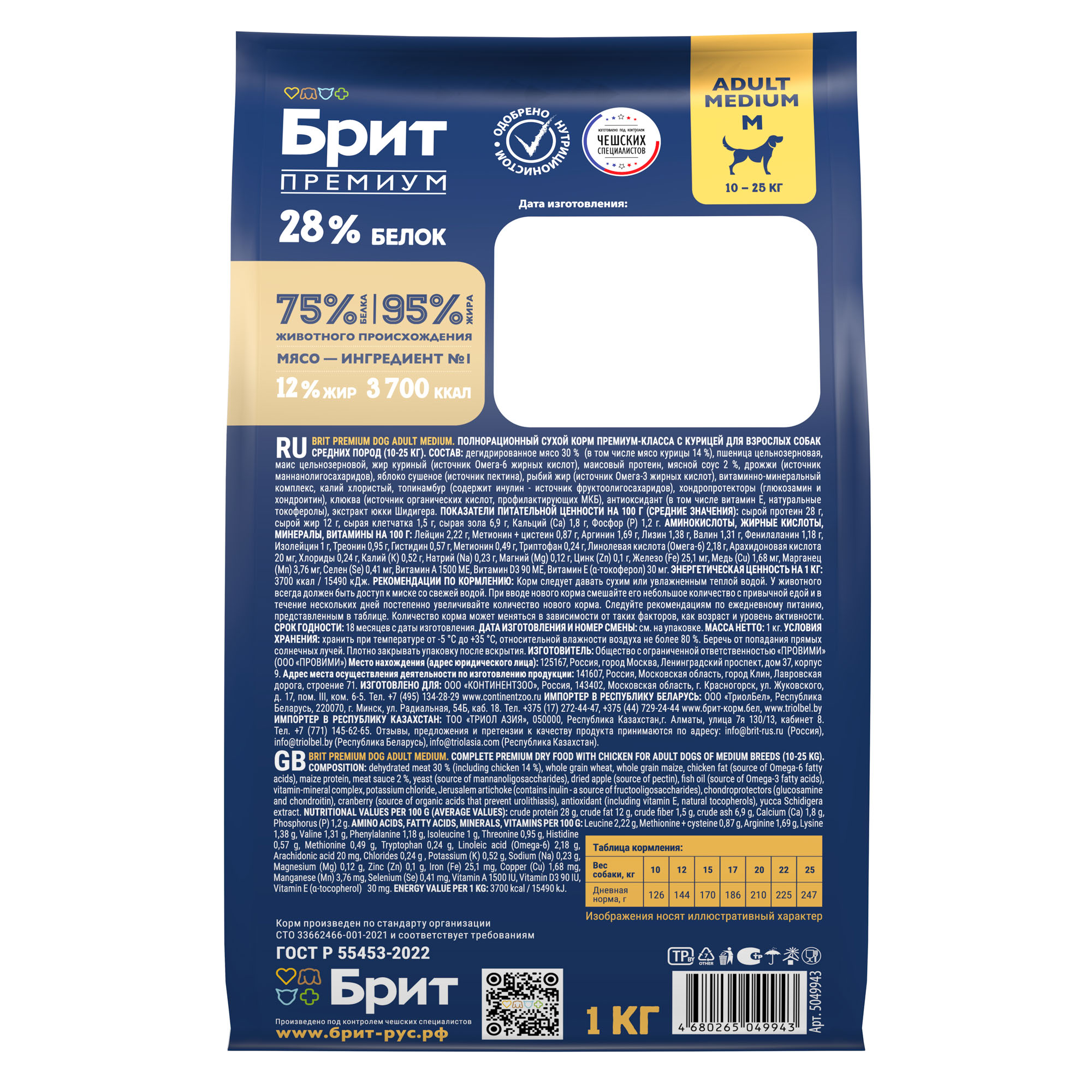 Полнорационный сухой корм Brit Premium Adult Medium с курицей для взрослых собак средних пород (10-25 кг).