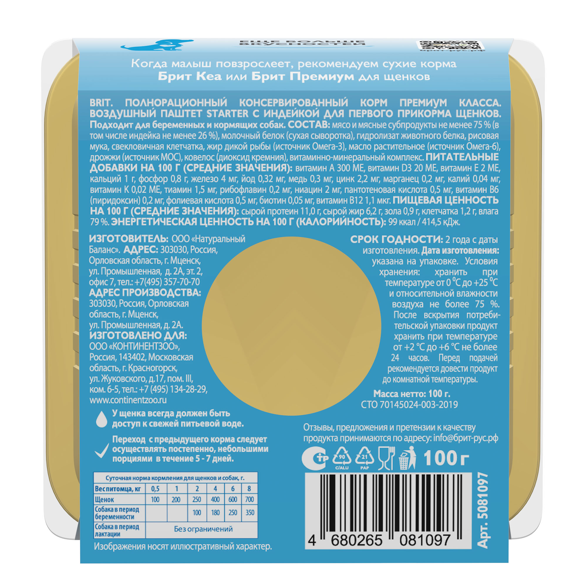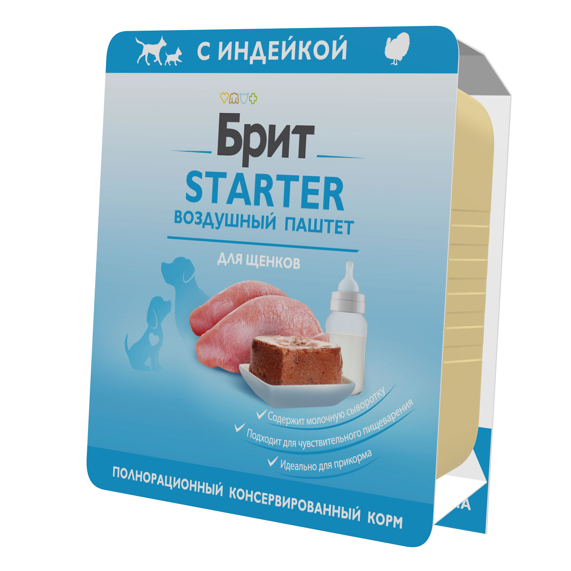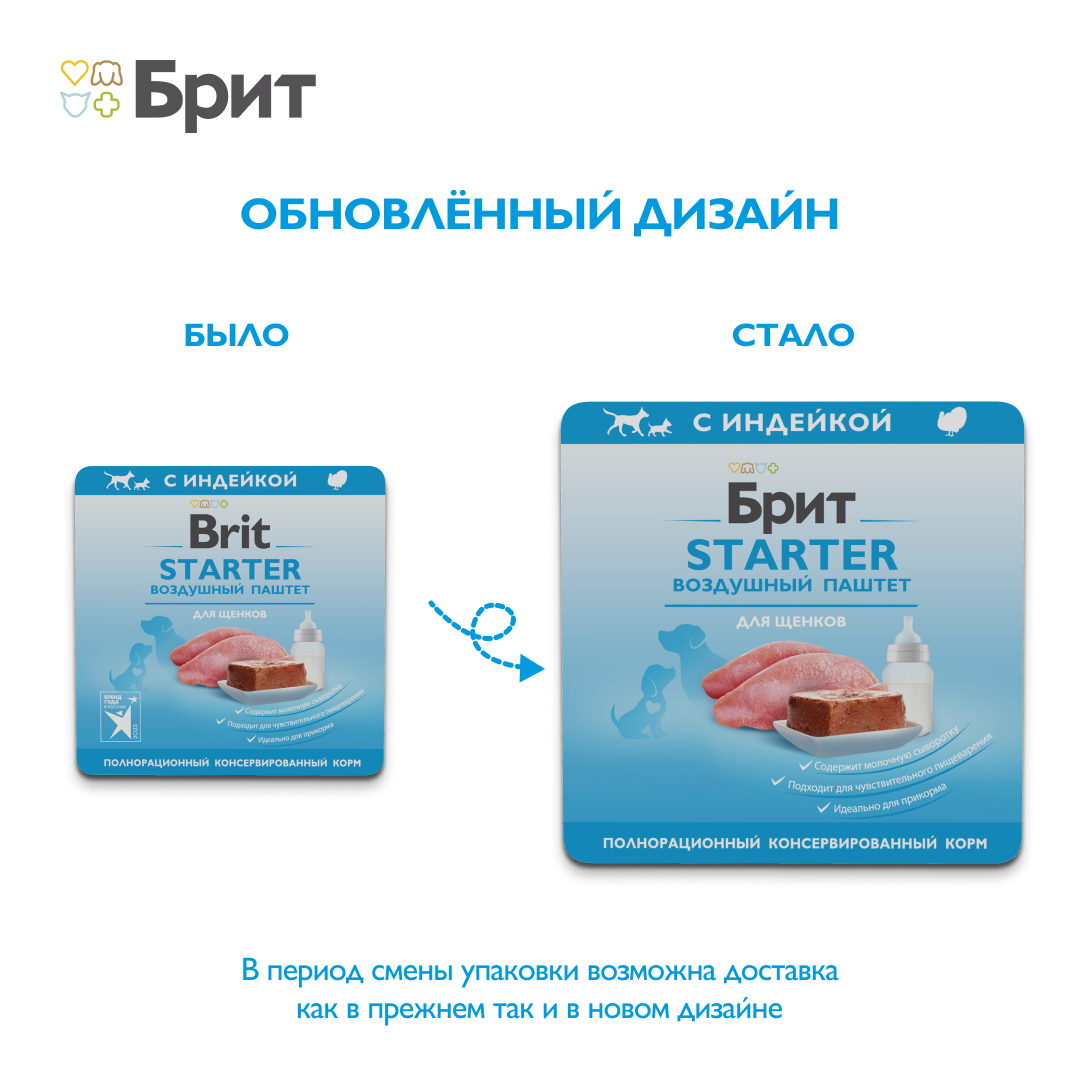 Нежный воздушный паштет BRIT STARTER создан специально для малышей и является идеальным вариантом для первого прикорма и приучения щенков к взрослой пище. Сбалансированный состав корма содержит не менее 75 % мяса и мясных субпродуктов, витамины и минералы для крепкого иммунитета, легкоусвояемой молочный белок в виде безлактозной сухой сыворотки и гидролизат животного белка, обогащающий корм незаменимыми аминокислотами, необходимыми для роста и развития. STARTER BRIT обладает идеальным балансом Омега-6 и Омега-3 жирных кислот, необходимых для построения тканей организма. Рисовая мука работает как гастропротектор, облегчая пищеварение, а соединение кремния – ковелос – как энтеросорбент, уменьшая болезненное газообразование и нейтрализуя патогенную микрофлору. Корм содержит пребиотический комплекс, который помогает щенкам быстрее привыкнуть к питанию взрослой пищей. Паштеты упакованы в ламистер — алюминиевую упаковку нового поколения, что означает герметичность, безопасность, простоту вскрытия и легкий вес.