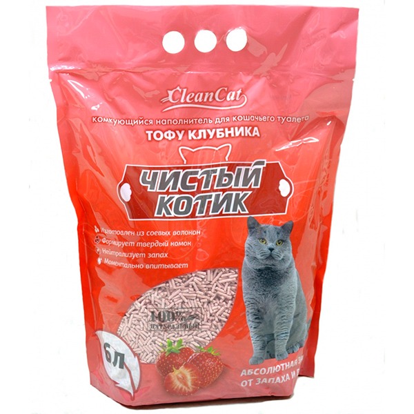 Комкующийся наполнитель «Чистый котик» ТОФУ КЛУБНИКА эффективно впитывают влагу: благодаря волоконной структуре при попадании жидкости спрессованные соевые гранулы образуют крепкий комок и надежно запирают запах внутри до 2-х недель. Экстракт клубники придает изделию приятный, легкий аромат. Наполнитель экономичен в потреблении и значит Ваш лоток надолго будет сухим и чистым. При попадании в канализацию волокна моментально растворяется, а его натуральный гипоаллергенный состав абсолютно безопасен не только для Вас и Вашего питомца, но и для окружающей среды. Состав: спрессованные соевые волокна 100%, экстракт клубники. Вес: 2,8 кг. Объем: 6 л.