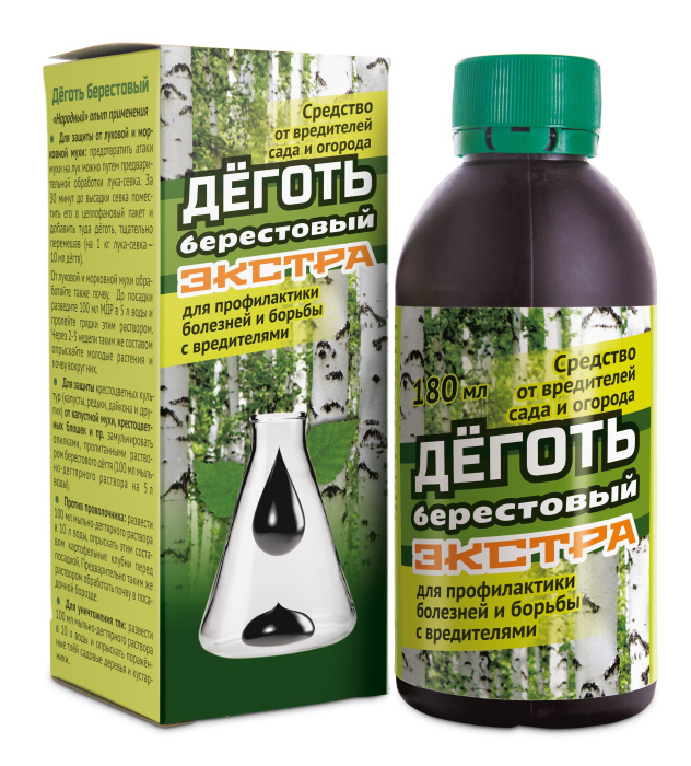 Дёготь берестовый — природное средство от вредителей сада и огорода. Отпугивает и уничтожает: тлю, клещей, бабочек, жуков и даже грызунов. Обеспечивает дезинфицирующий, обеззараживающий, антисептический, противомикробный, антипаразитарный и
