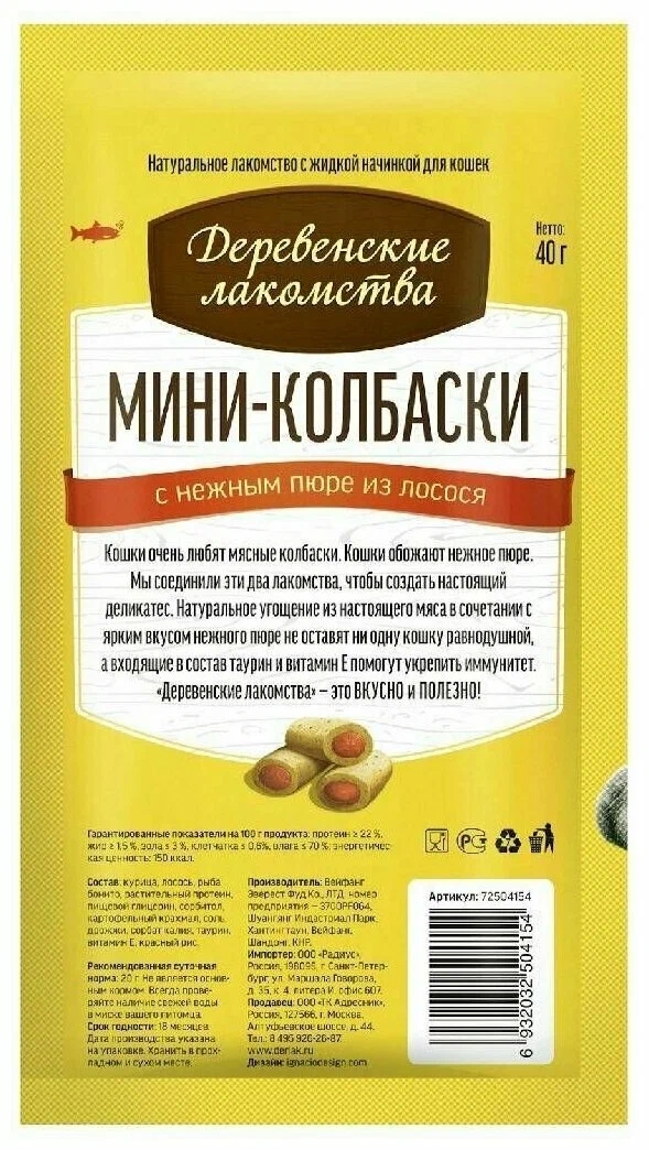 Кошки очень любят мясные колбаски. Кошки обожают нежное пюре. Мы соединили эти два лакомства, чтобы создать настоящий деликатес. Натуральное угощение из настоящего мяса в сочетании с ярким вкусом нежного пюре из лосося не оставят ни одну кошку равнодушной, а входящие в состав таурин и витамин Е помогут укрепить иммунитет.