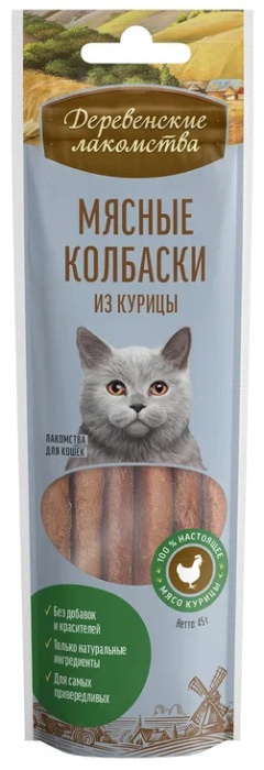 Лакомство Деревенские лакомства для кошек, мясные колбаски из курицы, 45 г. Лакомство Деревенские лакомства для кошек, мясные колбаски из курицы, 45 г. Нежнейшая курочка тщательно перемолота для того чтобы, стать любимым лакомством у вашей кошки. Вес (нетто): 45 г