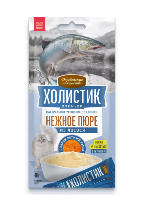 Изысканный десерт Холистик Премьер, нежнейшее пюре из отборного лосося с добавлением настоящего деликатеса - икры летучей рыбы. Яркий насыщенный вкус точно понравится вашей кошке, а удобная упаковка позволит вам проводить вместе незабываемые минуты. Рекомендуемая суточная норма - 10 г.