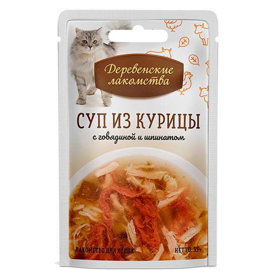 Мягкая текстура и аппетитный аромат супа из курицы с говядиной и шпинатом делают его особенно привлекательным даже для самых привередливых питомцев. Бульон, сваренный из натуральных ингредиентов, придает супу насыщенный вкус и помогает поддерживать водный баланс в организме кошки. Суп от «Деревенских лакомств» — это не просто еда, а настоящая забота и любовь к вашему пушистому другу.