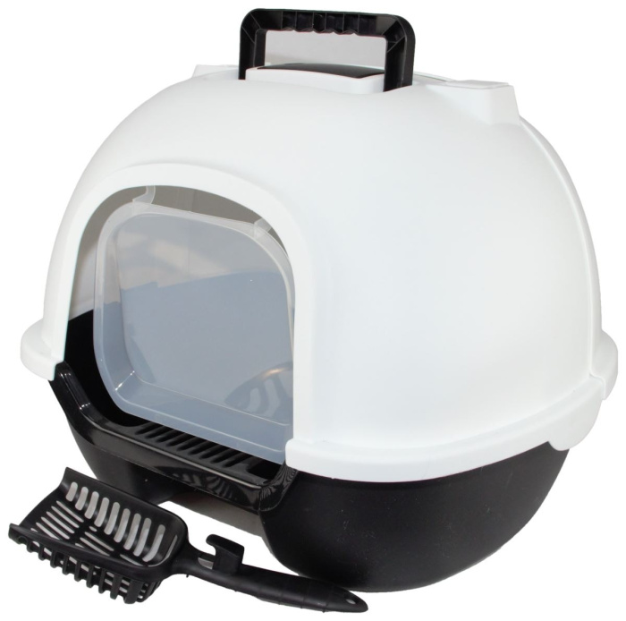 - главной отличительной чертой данной модели является то, что для уборки туалета теперь не надо снимать всю верхнюю крышку целиком или пытаться дотянуться через окошко, достаточно просто открыть заднюю часть крышки и весь лоток доступен для уборки, в закрытом состоянии задняя крышка фиксируется совком с крючком, что не позволит животному открыть крышку самостоятельно, совок входит в комплект;