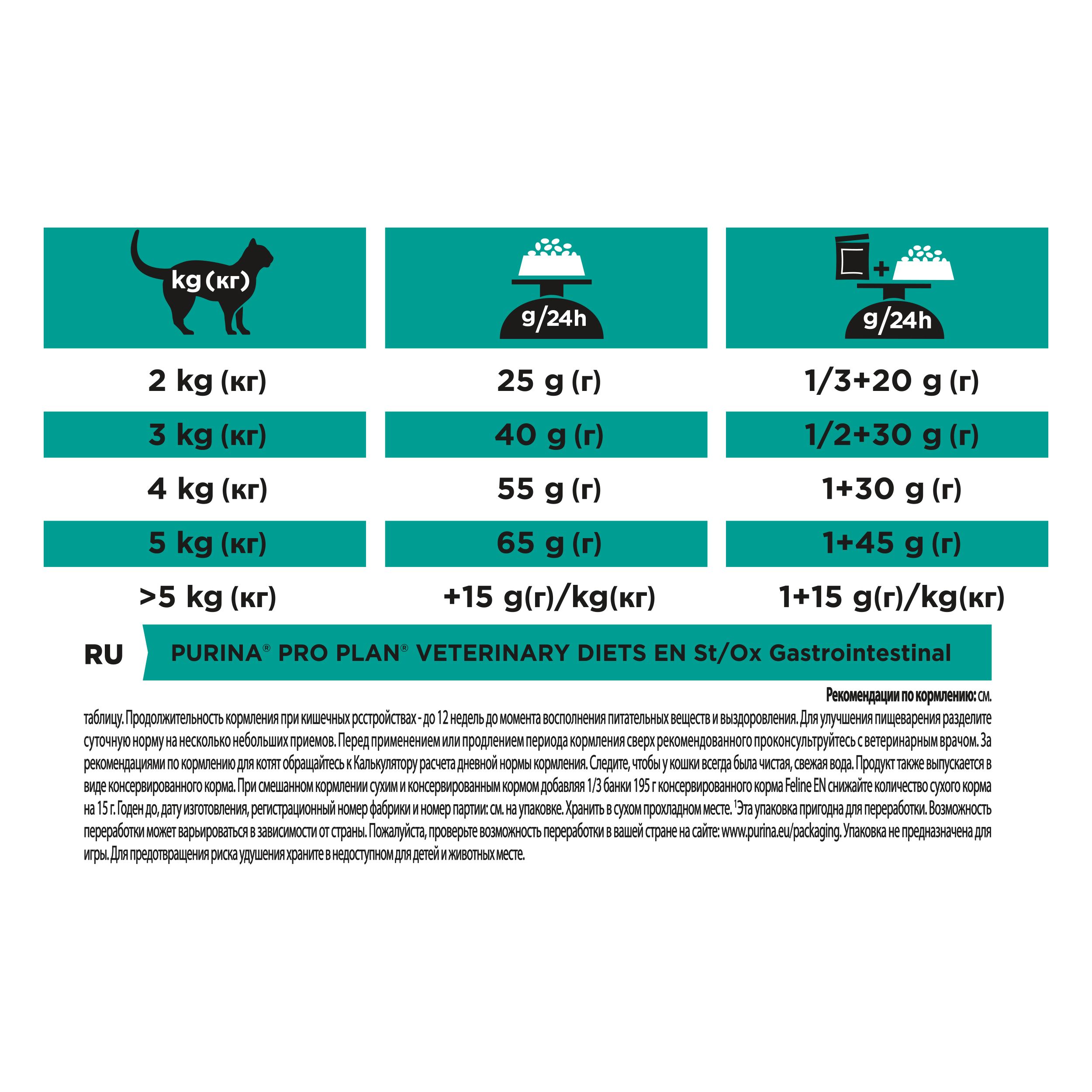 Корм сухой полнорационный диетический PRO PLAN® Veterinary Diets EN St/Ox Gastrointestinal (Гастроинтестинал) для взрослых кошек и котят для снижения проявлений кишечных расстройств, способствует восполнению питательных веществ и выздоровлению. Легкоусвояемый, с повышенным содержанием натрия и калия, высококалорийный, с высоким содержанием важнейших питательных веществ. Использование данного корма рекомендовано под наблюдением ветеринарного врача.