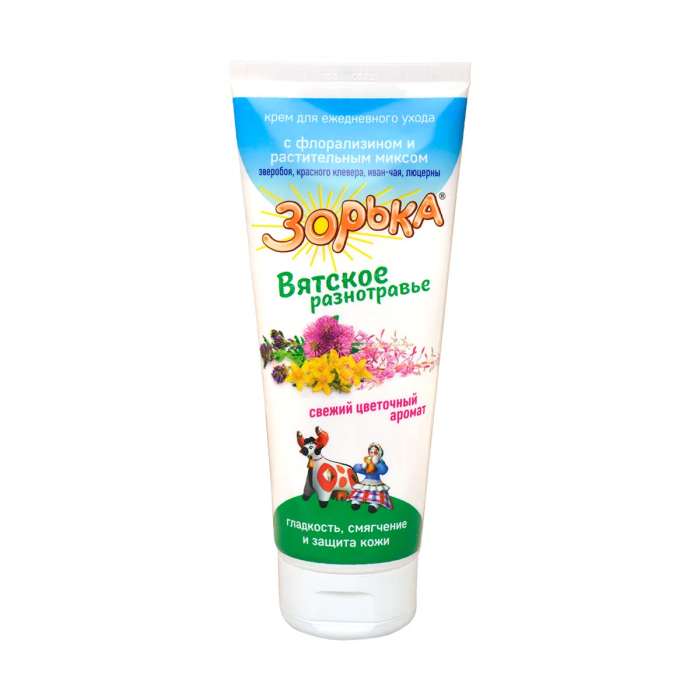 В состав крема «Зорька» Вятское разнотравье» с флорализином включен фитокомплекс из зверобоя, красного клевера, иван-чая и люцерны, придающий коже бархатистость и гладкость.