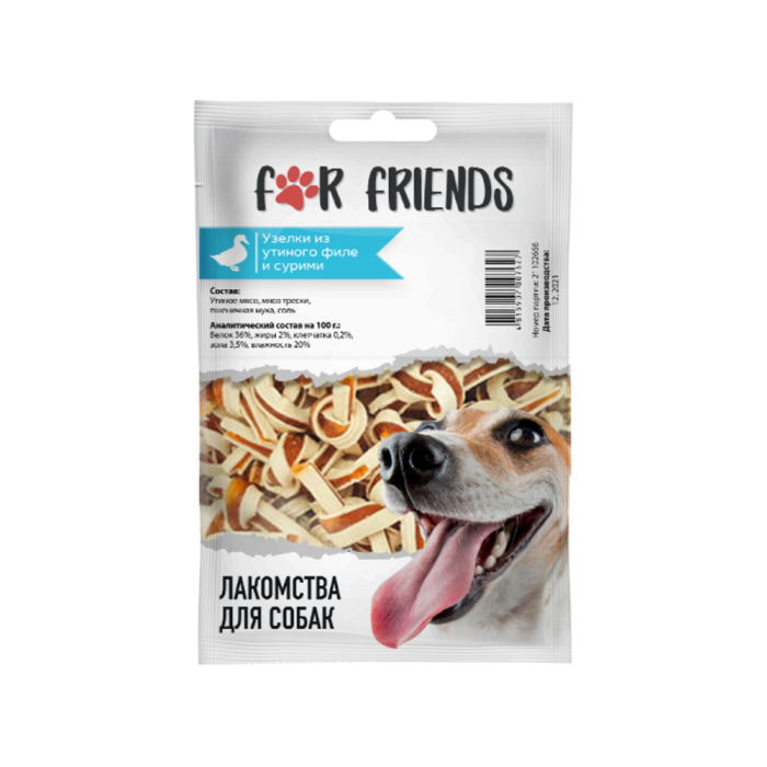 For Friends Лакомство для собак Узелки из утиного филе и сурими, 50 г. 100% натуральные ингредиенты, удобный размер и форма. Лакомство, которое подойдет для любой породы собак старше 3-х месяцев. Содержит питательные вещества и витамины. Разработан с учетом полноценного рациона собак.Насыщает организм полезными витаминами и минералами. Не содержит добавок и красителей. Благотворное влияние на состояние зубов и укрепляет челюстные мышцы. Удовлетворяют природную потребность собаки в грызении.