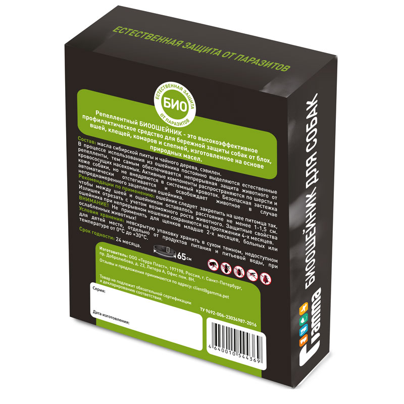 БИОошейник – это высокоэффективное средство для бережной защиты собак от блох, вшей, клещей, комаров и слепней, изготовленное на основе растительных масел. В процессе использования из ошейника постоянно выделяются естественные репелленты, тем самым обеспечивается непрерывная защита животного от кровососущих насекомых. Активные компоненты распространяются по шерсти и коже собаки, но не внедряются в системный кровоток. БИОошейник безопасен для собаки и человека, так как в его состав входят исключительно природные репелленты. Размер ошейника 650*9*3мм.