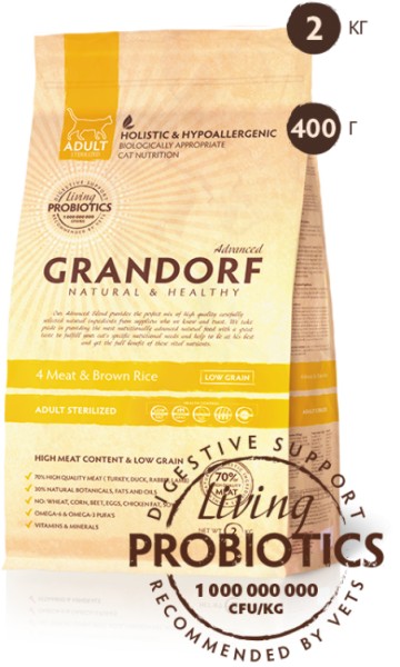 Сухой корм для стерилизованных кошек Grandorf Living Probiotics 4 Meat & Brown Rice Adult Sterilized — революционный гипоаллергенный корм, который содержит живые и полезные пробиотические бактерии. 109 живых пробиотиков (1 000 000 000 / один миллиард Enterococcus faecium) на 1кг продукта. Ежедневное употребление способствует восстановлению и поддержанию микрофлоры кишечника, ведь, как известно, на правильной работе системы пищеварения основывается общее здоровье и состояние организма. Живые пробиотики добавляются после полного изготовления корма, в специальных кислотоустойчивых, кишечнорастворимых микрокапсулах, вследствие чего все полезные бактерии не погибают, а остаются живыми и эффективно выполняют свою задачу.