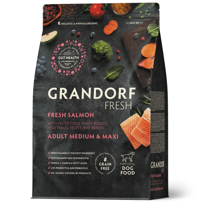 Сухой беззерновой корм со свежим филе лосося и бататом предназначен для взрослых собак средних и крупных пород. Благодаря живым пробиотикам, он способствует улучшению здоровья кожи и шерсти, а также подходит для собак, склонных к аллергическим реакциям.