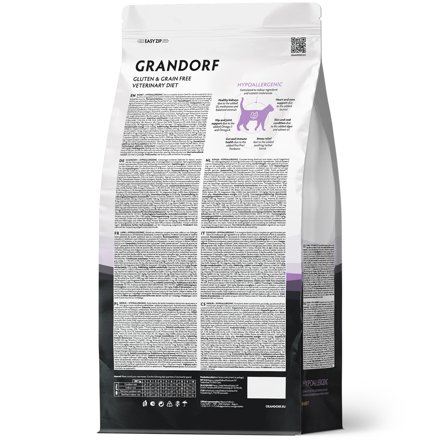 Гидролизованный белок кролика* (36%), Батат**, Картофельные хлопья**, Жир индейки (7%), Подсолнечное масло (3%), Гидролизованные дрожжи (природный источник MOS и бета-глюканов), Льняное семя, Масло лосося (2%), Порошок корней цикория (натуральный источник пребиотиков: FOS и инулин), Минералы, Масло водорослей (натуральный источник ЭПК и ДГК) (0,3%), Травы сушёные (юкка Шидигера, ромашка, пассифлора, ромашка римская), Экстракт ферментации (Lactobacillus acidophilus), Сопутствующий продукт ферментации Bacillus subtilis, Сопутствующий продукт ферментации Aspergillus niger, Белок одноклеточных организмов (Bacillus subtilis, Bacillus licheniformis, Trichoderma viride). *Источник белка. **Источник углеводов.