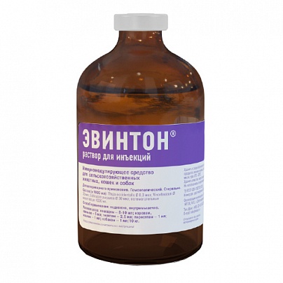 Эвинтон обладает неспецифическим иммуномодулирующим действием, восстанавливает нарушенную иммунологическую реактивность, активирует ряд показателей, характеризующих естественную неспецифическую резистентность организма животных. По степени воздействия на организм теплокровных животных препарат относится к малоопасным веществам, не обладает местнораздражающим и сенсибилизирующим действием. Гомеопатические компоненты, входящие в состав Эвинтона в сверхмалых дозах, не накапливаются в организме животного.