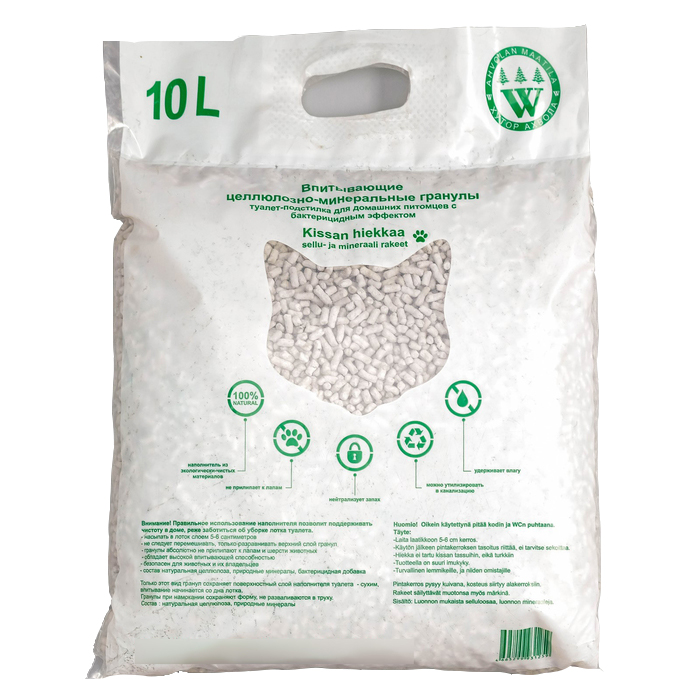 В отличии от прессованных древесных гранул, разваливающихся в труху при попадании влаги, гранулы из целлюлозно-минеральной композиции производятся по другой технологии, гранулы имеют витую волокнисто-капиллярную структуру, набухают при попадании влаги, но сохраняют целостную форму, не разносятся из лотка.