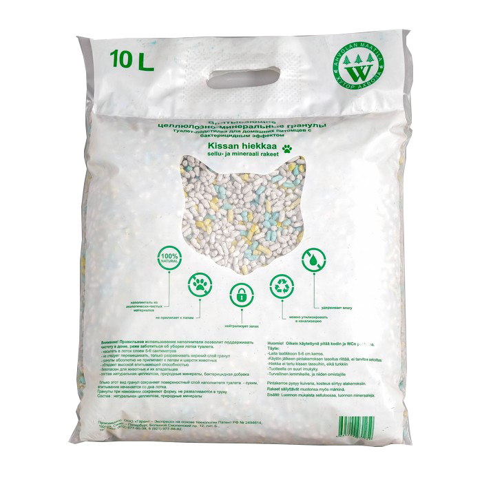 В отличии от прессованных древесных гранул, разваливающихся в труху при попадании влаги, гранулы из целлюлозно-минеральной композиции производятся по другой технологии, гранулы имеют витую волокнисто-капиллярную структуру, набухают при попадании влаги, но сохраняют целостную форму, не разносятся из лотка.