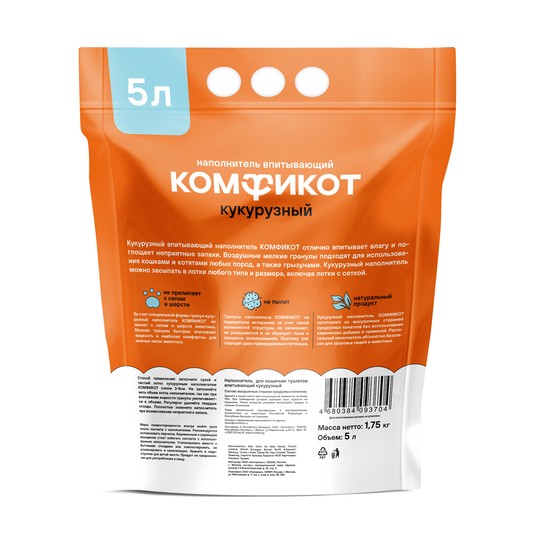 Кукурузный впитывающий наполнитель КОМФИКОТ отлично впитывает влагу и поглощает неприятные запахи. Воздушные мелкие гранулы подходят для использования кошками и котятами любых пород, а также грызунами. Кукурузный наполнитель можно засыпать в лотки любого типа и размера, включая лотки с сеткой. Способ применения: заполните сухой и чистый лоток кукурузным наполнителем КОМФИКОТ слоем 3-4 см. Не заполняйте весь объем лотка наполнителем, так как при впитывании жидкости гранулы увеличиваются в объеме. Регулярно удаляйте твердые отходы. Полностью замените наполнитель при возникновении неприятного запаха. Состав: высушенные стержни кукурузных початков. Масса нетто: 1,75 кг. Объем: 5 л.
