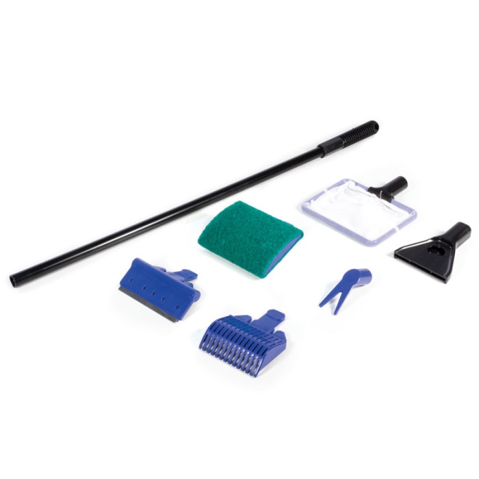 Набор инструментов для ухода за аквариумом включает в себя два скребка (мягкий и металлическое лезвие), сачок, насадки для грунта и растений, которые могут меняться на едином держателе по мере необходимости. Может ипользоваться в пресной и соленой воде.