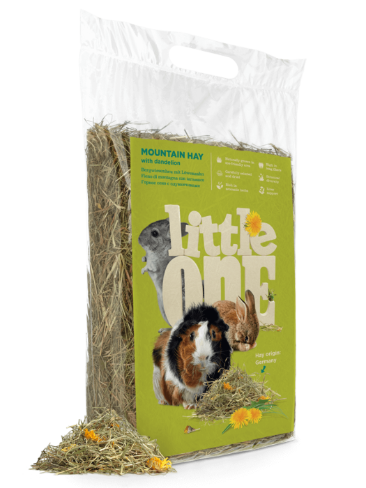 Горное сено с одуванчиком Little One — ароматное, очищенное и высушенное; собрано в экологически чистых горных районах и обогащено цветами одуванчика. Сено является основной составляющей рациона всех травоядных животных (кроликов, морских свинок, шиншилл, дегу), поэтому важно обеспечить его постоянное наличие в клетке.
