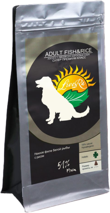 LiveRa ADULT FISH&RICE (Нежное филе белой рыбы с рисом) 51% рыбы — это полноценный сбалансированный рацион для взрослых собак с филе рыбы океанических пород. Сбалансированный состав полностью удовлетворит потребность даже самого привередливого в питании питомца. Рыба — источник легкоусвояемого животного протеина, который не только служит источником энергии, но иучаствует в обновлении органов и тканей, формировании ферментов и гормонов, выработке иммунных тел. Также этот продукт богат незаменимыми жирными кислотами Омега-3 и Омега-6, что позволяет сохранить здоровье сердечно-сосудистой системы и отсрочить старение, оказывает положительное влияние на шерсть, что позволяет избавиться от избыточной линьки и проплешин. Корм содержит полезные, натуральные, легко усваиваемые ингредиенты без добавления искусственных ароматизаторов, а также все необходимые витамины и микроэлементы, которые обеспечат превосходное физическое состояние и долгую здоровую жизнь домашним любимцам.