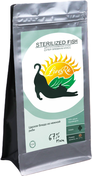 LiveRa STERILIZED FISH (царское блюдо из нежной рыбы) 67% мяса — легкоусваиваемый полноценный рацион профессионального питания для стерилизованных кошек со вкусом рыбы. Корм STERILIZED FISH — это уникальный комплекс, способствующий тому, чтобы животное оставалось здоровым, активными и игривыми, наслаждаясь полной жизнью и даря Вам радость. Уникальный состав корма создан на основе натуральных компонентов с добавлением необходимых витаминов и минералов, необходимых для поддержания здоровья кошек. Сбор трав, входящий в состав корма, улучшает работу желудочно-кишечного тракта, поддерживает иммунитет, способствует улучшению качества шерсти и состояния кожи. Содержит большое количество таурина для хорошего зрения и здорового сердца. Содержит источники натуральной клетчатки для выведения волосяных комочков из пищеварительного тракта.
