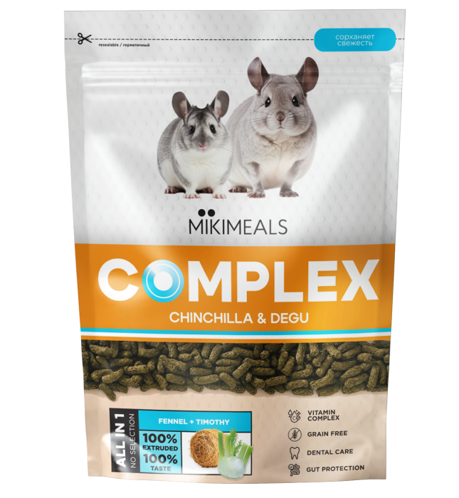 MIKIMEALS COMPLEX для шиншилл и дегу - это полноценный, обогащенный витаминами, вкусный корм, приготовленный для Ваших питомцев методом экструзии, что существенно повышает усвояемость готового продукта и входящих в его состав ингредиентов, а также улучшает питательную ценность и гарантирует предотвращение развития в составе корма вредных микроорганизмов.