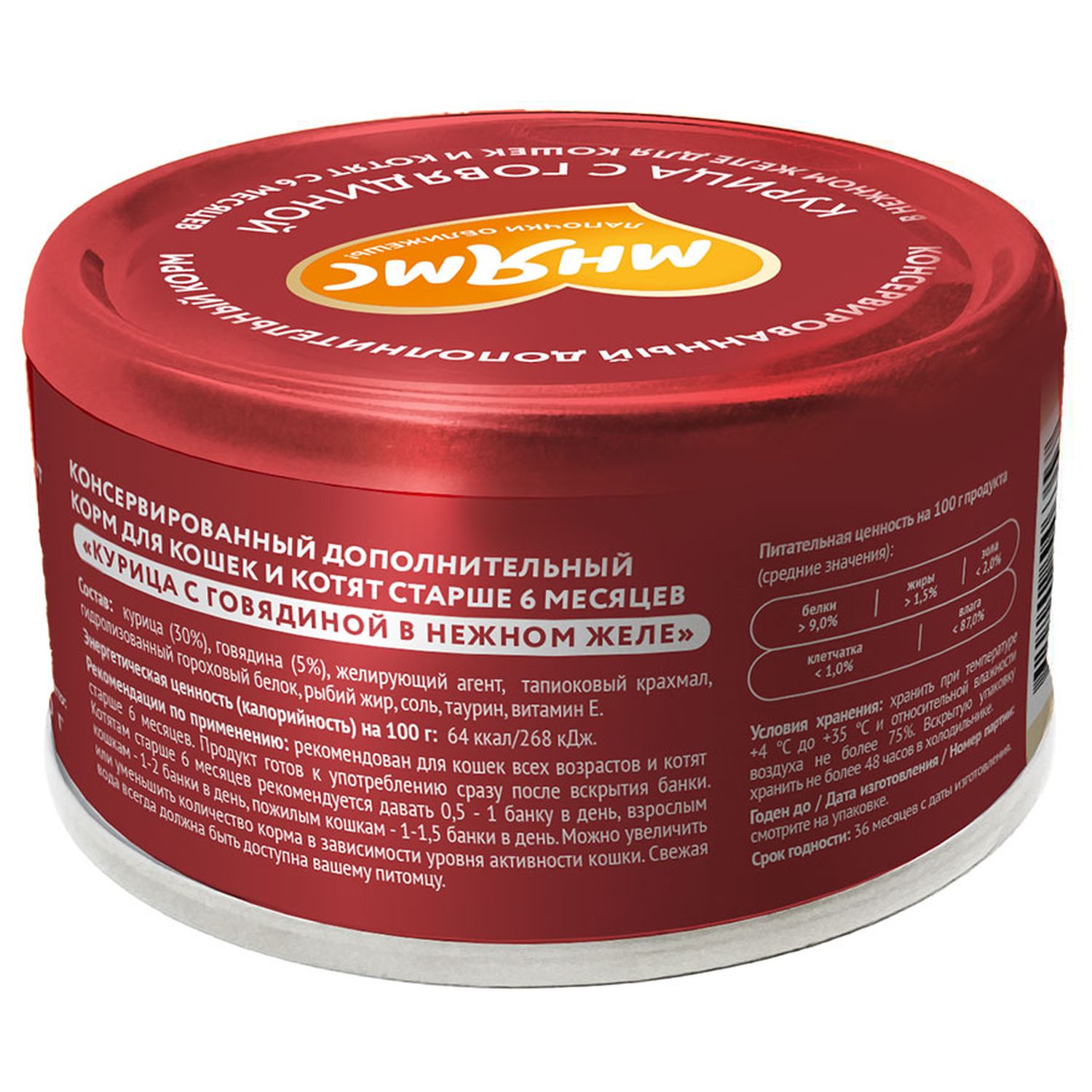Консервированный дополнительный корм для кошек и котят старше 6 месяцев «Курица с говядиной в нежном желе" 80 г. Содержит в составе натуральное мясо курицы и говядины, которое хорошо усваивается организмом и имеет высокую питательную ценность и вкусовую привлекательность. Корм "Курица с говядиной в нежном желе" рекомендуется использовать в качестве дополнительного источника питания к основному рациону вашей кошки. При этом важно учитывать индивидуальные потребности животного, включая его вес, возраст и уровень активности. Котятам старше 6 месяцев рекомендуется давать - 40-80 г в день, взрослым кошкам - 80-160 г в день, пожилым кошкам - 80-120 г в день. Свежая вода всегда должна быть доступна вашему питомцу. Прекрасно подходит привередливым кошкам, а также питомцам со сниженным потреблением воды. «Мнямс» консервированный дополнительный корм для для кошек и котят старше 6 месяцев «Курица в нежном желе" гарантирует, что ваш питомец получит только качественный и вкусный продукт, который прекрасно разнообразит его рацион, поддержит здоровье и обеспечит энергией.