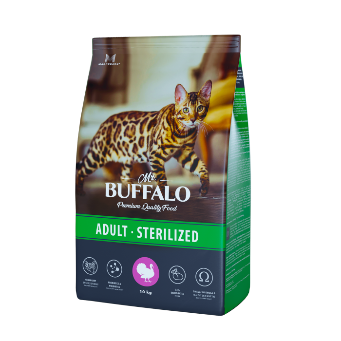 Полнорационный сухой корм Mr.Buffalo STERILIZED разработан с учётом потребностей стерилизованных кошек и кастрированных котов, включает все необходимые питательные вещества для поддержания жизненных сил, здоровья мочевыделительной системы, поддержания оптимального веса и мышечной массы питомца.