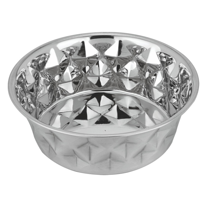 Стильная миска для кормления питомцев из нержавеющей стали. Дизайн миски имитирует огранку драгоценных камней, подчёркивая важность приема пищи для вашего питомца. Удобная эргономичная форма миски наилучшим образом подходит для всех видов корма и воды. Миска устойчива и не переворачивается за счет силиконовой накладки на дне. Прочный и безопасный материал – нержавеющая сталь – надолго сохранят свежесть воды и корма. Объем – 1,2 л Преимущества аксессуаров из нержавеющей стали: • Долговечность. Нержавеющая сталь – очень прочный и износостойкий материал. • Безопасность. Нержавеющая сталь совершенно безопасна для животного. Даже при длительной эксплуатации материал не выделяет в воду и пищу вредоносных веществ. • Гигиеничность. Нержавеющая сталь не царапается и не трескается, а значит, в местах повреждений не будут скапливаться бактерии. • Отсутствие запаха. Нержавеющая сталь не имеет запаха и не влияет на вкус воды или пищи.