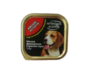 Влажный корм для собак, мясные фрикадельки мясное ассорти в нежном соусе, соус на натуральном бульоне, изготовлены из качественного российского сырья, не содержит сои, консервантов, искусственных красителей, ароматизаторов и генномодифицированных ингридиентов