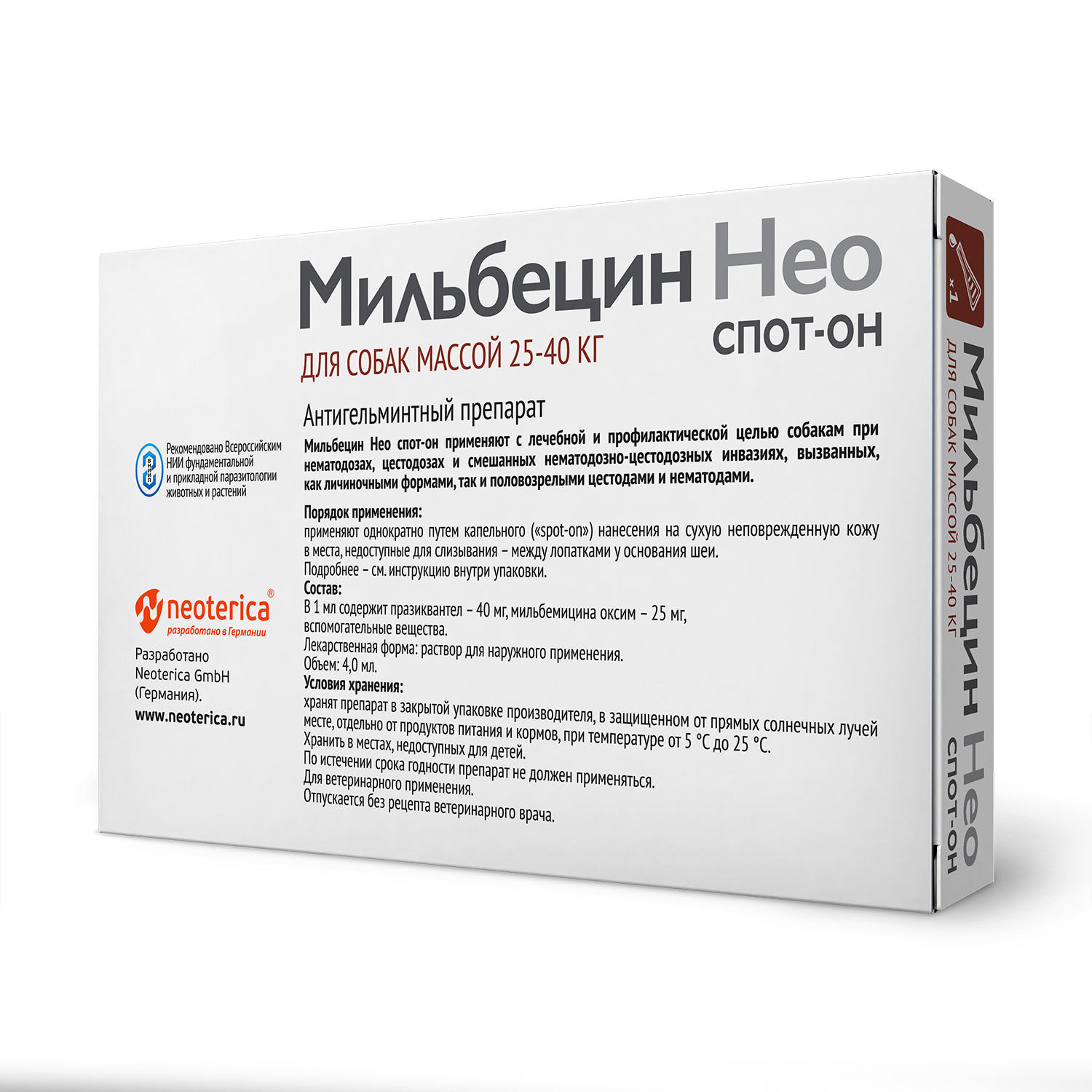 Мильбецин Нео Spot-on для кошек и собак - препарат широкого спектра действия. Давайте препарат однократно, как с профилактической, так и с лечебной целью. Капли действуют 1 месяц.