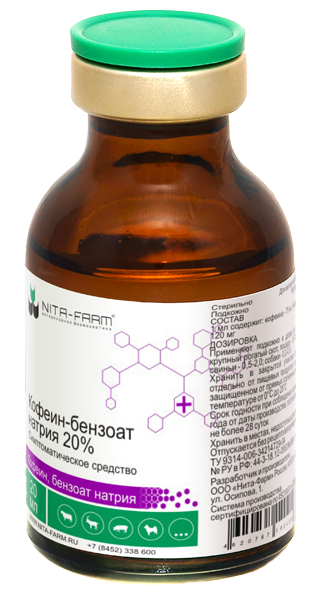 Кофеина бензоат натрия обладает возбуждающим действием на центральную нервную систему животных. Он усиливает и регулирует процессы возбуждения в коре головного мозга, усиливает условные рефлексы и повышает двигательную активность. Стимулирующее действие кофеина приводит к повышению физической работоспособности, уменьшению усталости и сонливости. Действие препарата зависит от дозы, а также от типа высшей нервной деятельности животных. Под влиянием препарата усиливается сердечная деятельность, диурез, увеличивается газообмен, повышается водный и азотистый обмен.