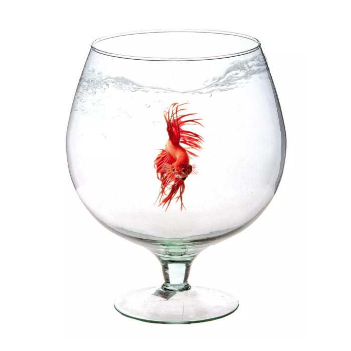 Стеклянная ваза в форме большого бокала. Изделие можно использовать как в качестве аквариума для содержания рыбок небольшого размера, или рыб, которых необходимо содержать в одиночестве. Также можно использовать в качестве аквариума для выращивания аквариумных растений без рыбок.