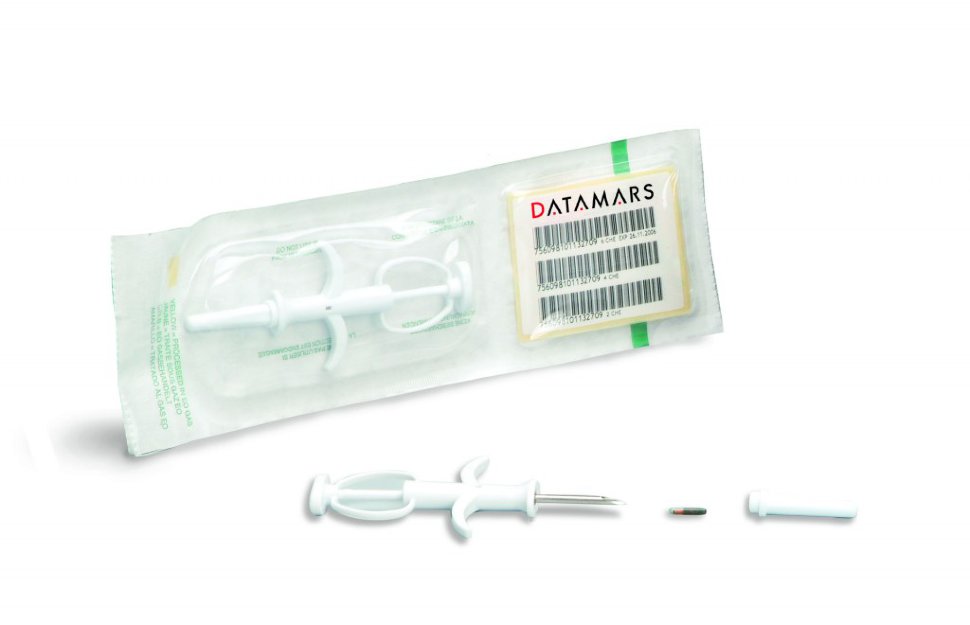 Радиочастотный микрочип размером всего 13,3 х 2,12 мм. Внутри