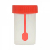 Контейнер для сбора кала изготовлен из ультрачистого полипропилена или прозрачного медицинского полистирола, оба материала являются химически нейтральными и бактериально чистыми и механически устойчивыми веществами. В крышку контейнера для сбора кала вделана лопатка (ложка) - отборник (30 мл) или шпатель (60 мл) - для удобства взятия материала.