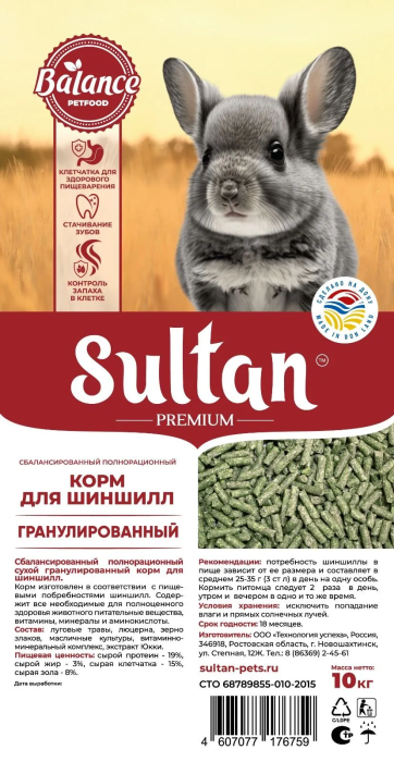 Корм Султан Premium для шиншилл - это высококачественный продукт, разработанный специально для взрослых шиншилл. Формула корма соответствует потребностям ваших питомцев. Благодаря уникальной технологии, каждая гранула содержит полный баланс всех компонентов, входящих в состав корма, что исключает возможность селективного поведения животного во время еды. А именно, с каждой гранулой животное получает полный набор питательных веществ, клетчатки, белков, микроэлементов, витаминов, а не выбирает только свои любимые зерна и фрукты. Такое полнорационное питание способствует здоровому состоянию организма и пищеварительной системы. Корм для шиншилл Султан имеет выверенное соотношение белков, жиров и углеводов гарантирует полноценную активность и развитие взрослой шиншиллы. Учитывает особые потребности животных, такие как уход за зубами и правильное пищеварение.