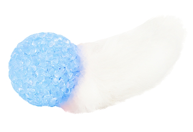 Привлекательная натуральная игрушка для кошек - высушенный кроличий хвост в шерсти, прикреплённый к пластиковому мячику с бубенчиком.