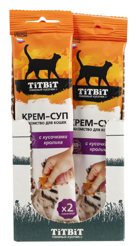 Крем-суп для кошек TITBIT – это специально разработанные вкусные и полезные продукты, которые: 1. Содержат кусочки свежего мяса; 2. Содержат 98% мясных ингредиентов; 3. Содержат дополнительные полезные ингредиенты (таурин для поддержки зрения, сердца, пищеварительной, половой и иммунной систем; морковь для поддержки зрения и пищеварения; петрушка для поддержки мочеполовой, сердечно-сосудистой и пищеварительной систем).
