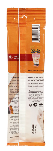 Крем-суп для кошек TITBIT – это специально разработанные вкусные и полезные продукты, которые: 1. Содержат кусочки свежего мяса; 2. Содержат 98% мясных ингредиентов; 3. Содержат дополнительные полезные ингредиенты (таурин для поддержки зрения, сердца, пищеварительной, половой и иммунной систем; морковь для поддержки зрения и пищеварения; петрушка для поддержки мочеполовой, сердечно-сосудистой и пищеварительной систем).