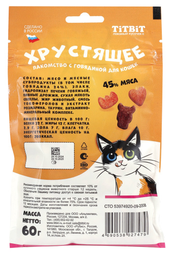 Лакомство хрустящее для кошек - это жевательный снек для Вашего четвероногого друга, необходимый для снятия мягкого зубного налёта, снижения уровня зубного камня и массажа дёсен за счет специально разработанной формы и текстуры, используется в качестве лакомства и поощрения. При производстве хрустящих гранул мы используем только натуральные ингредиенты, что обеспечивает любимца ценным высококачественным белком и придает угощению неповторимый вкус и аромат. Ни один гурман не останется равнодушным к такому угощению.