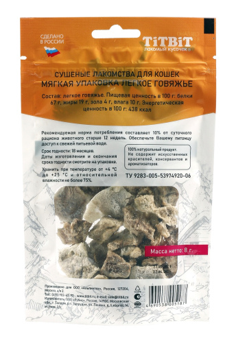 Высушенные воздушные кусочки говяжьего легкого. Отличаются высоким содержанием микроэлементов и соединительной ткани. Легкие очень вкусны, малокалорийны и замечательно усваиваются организмом. Легкие содержат практически такой же набор витаминов, как и мясо, но гораздо меньше жира.