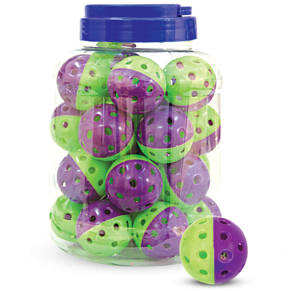 Игрушка для кошки "Мяч-погремушка" - универсальный аксессуар, который позволит не только увлечь пушистого питомца динамичной игрой, но и поможет улучшить моторику мышц животного, развить его умственные способности и смекалку. Мячики сетчатой структуры изготовлены из качественного нетоксичного пластика яркой расцветки и имеют встроенную погремушку, которая привлечет внимание питомца к подвижному аксессуару и настроит его на активную охоту. Игрушки поставляются в прозрачных пластиковых банках (25 шт. в упаковке). Цвет изделия: фиолетово-зеленый. Размер: d40мм.
