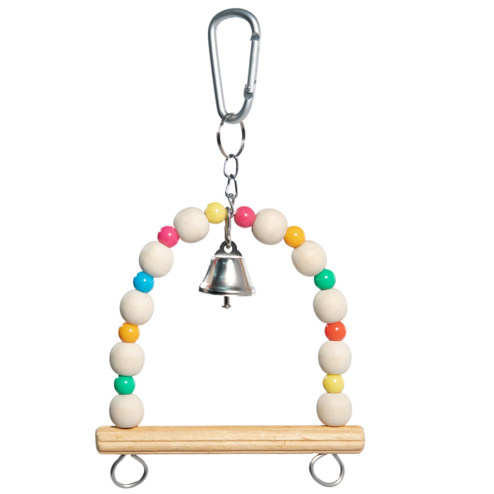 Игрушка для птиц в виде качелей из деревянных и пластиковых бус и колокольчика. Крепление: карабин. Цвет: натуральное дерево. Размер: 160/210*120мм.