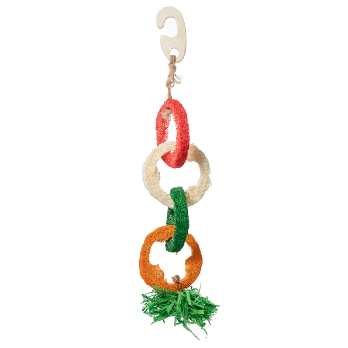 Игрушка-подвеска для птиц, состоящая из четырех разноцветных долек люфы с кукурузными листьями. Крепление: деревянный крючок. Цвет: разноцветный. Размер: 280/320*65мм.
