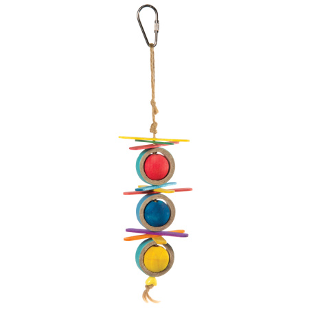 Игрушка для птиц в виде подвески с деревянными шариками в картонных колечках и палочками-вертушками. Крепление: карабин. Цвет: в ассортименте. Размер: 240/270*65мм.