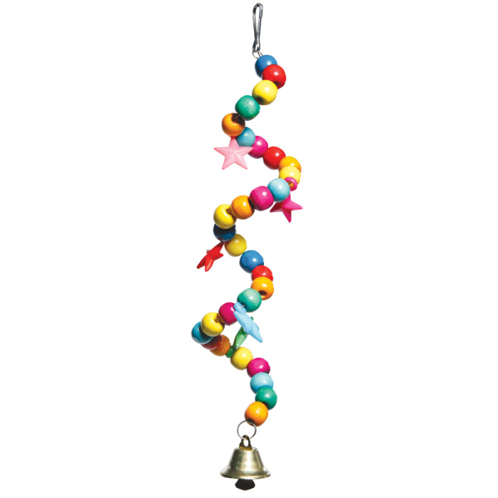 Игрушка для птиц в виде змейки из бусинок и звездочек с колокольчиком. Форма спирали может отличаться от представленной на фотографии. Цвет: разноцветный. Размер: 165*30мм.